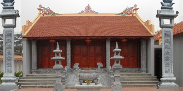 Là công trình đúc bê tông cốt thép, hoàn thiện bề mặt giả vân gỗ, kiến trúc theo nhà kẻ truyền Bắc Bộ. Giữ vẻ đẹp cổ điển nhưng bền hơn gỗ tự nhiên — không mối mọt, không cong vênh, tuổi thọ 50-100 năm.